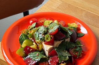 silken tofu "caprese" salad with thai basil, cucumber and stone fruit