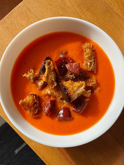 roasted red pepper and tomato soup with chunky chorizo-y croutons