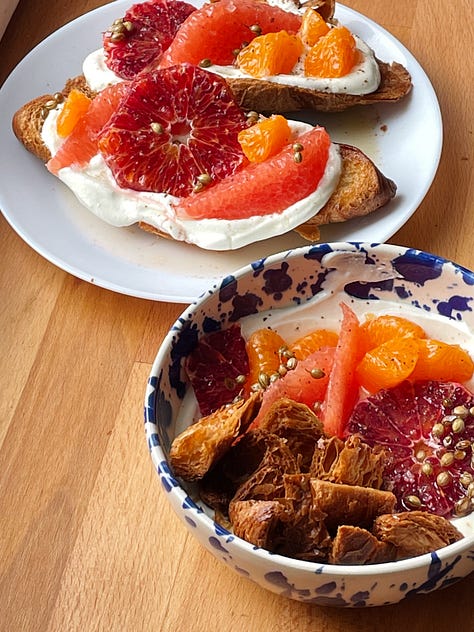 croissant toast with mixed citrus, mascarpone and coriander honey syrup