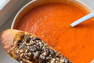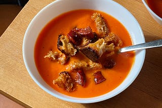 roasted red pepper and tomato soup with chunky chorizo-y croutons